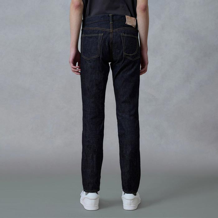 股上がやや浅めで、裾に向かって強めにテーパードの入った細めのストレート。