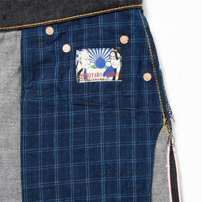 桃の形にシンボライズされた二本のイエローステッチがポイントの銅丹(どうたん)レーベル。