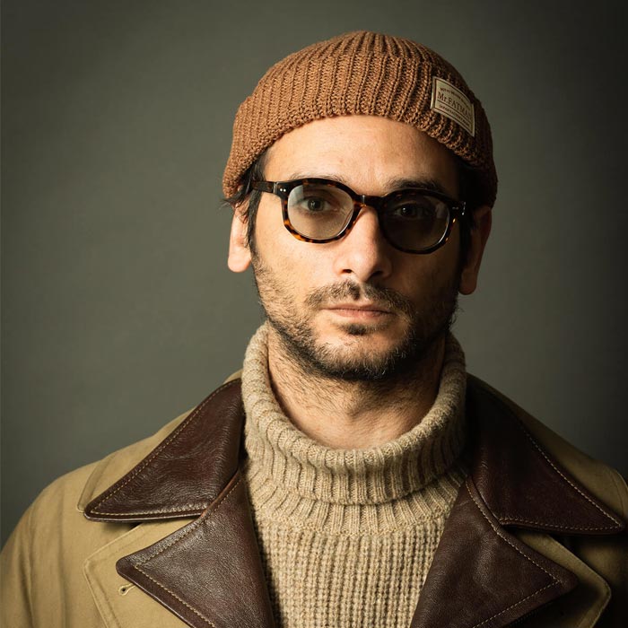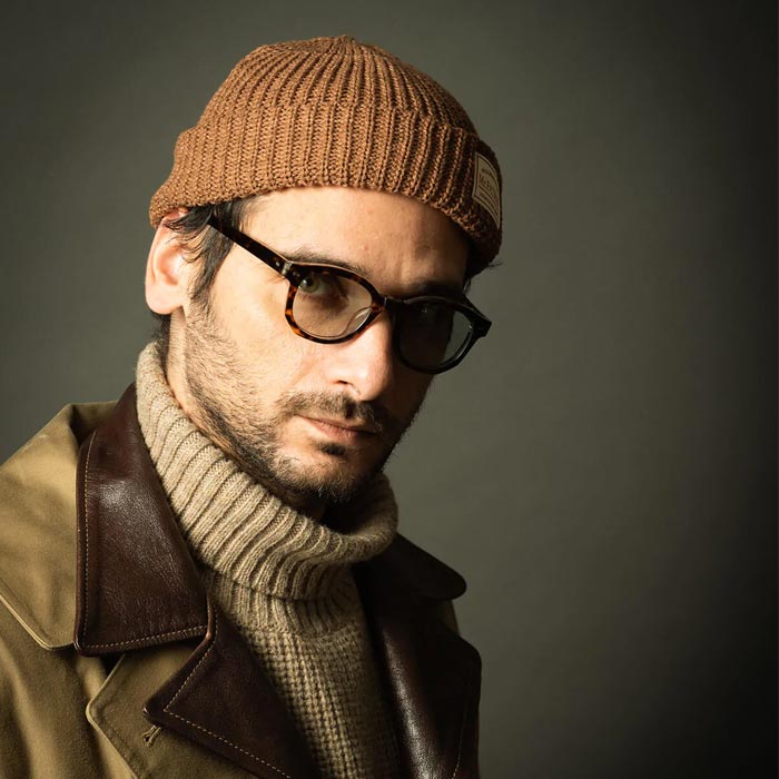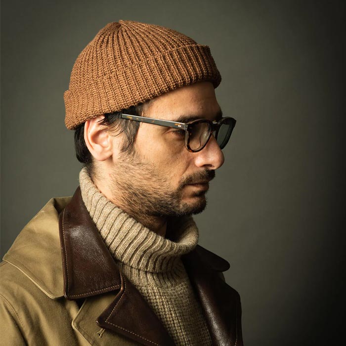 左おでこ部分に織ネームが縫い付けられ、使い込めば使い込むほど頭に馴染み、味・愛着が湧いてくるニットワッチ。