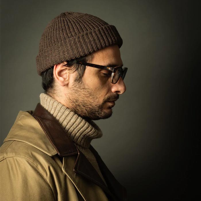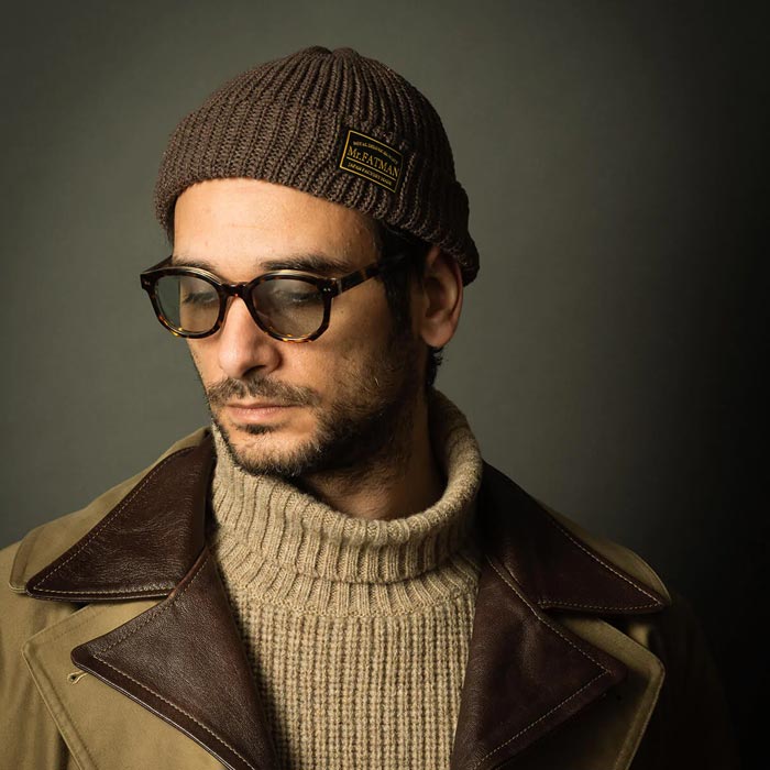 左おでこ部分に織ネームが縫い付けられ、使い込めば使い込むほど頭に馴染み、味・愛着が湧いてくるニットワッチ。