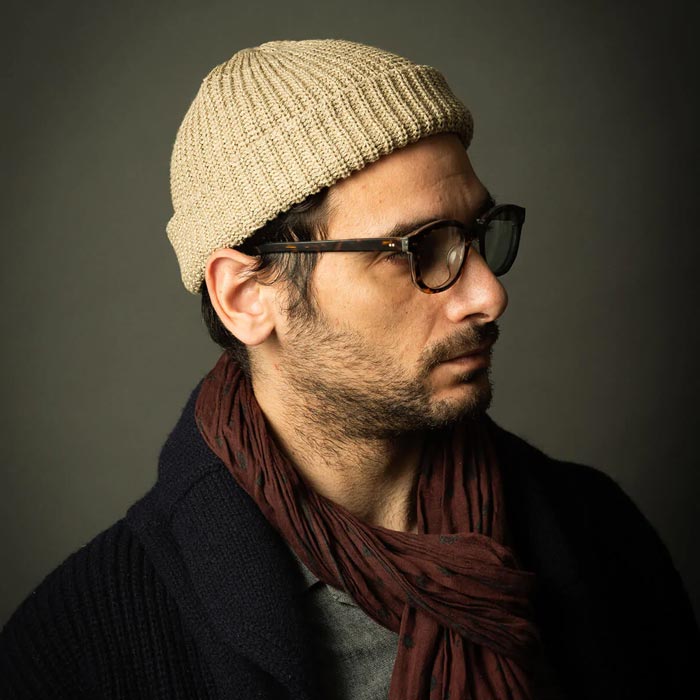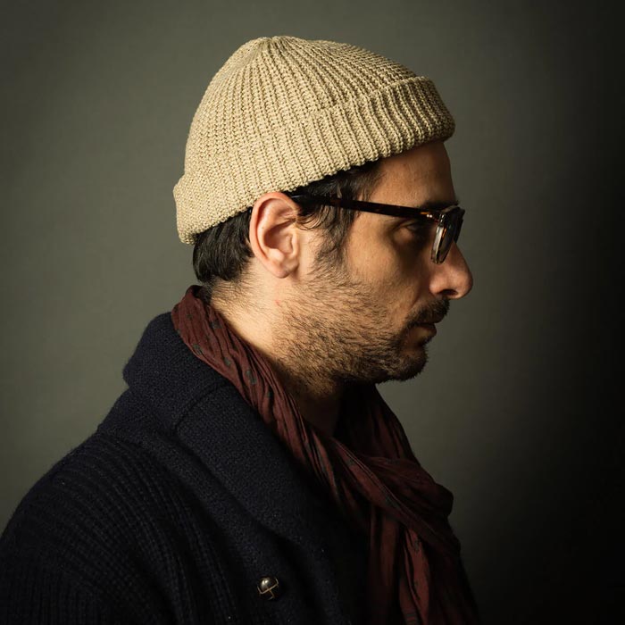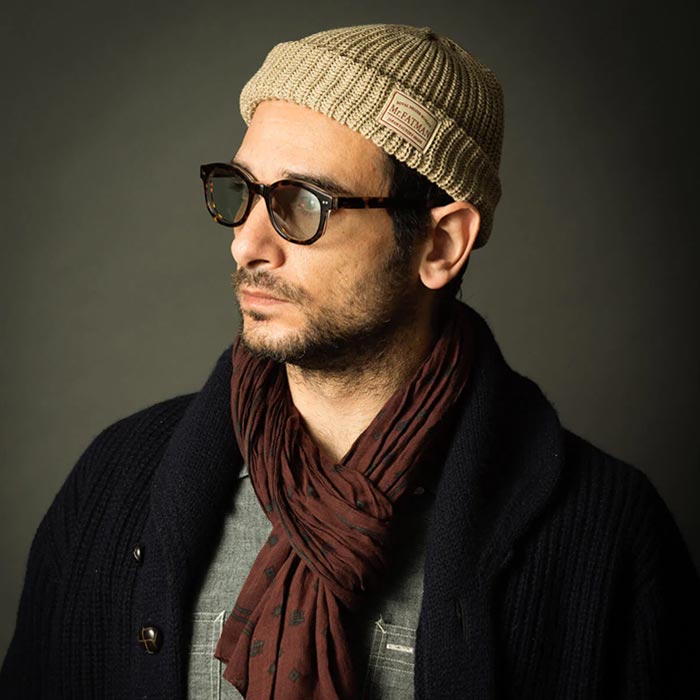 左おでこ部分に織ネームが縫い付けられ、使い込めば使い込むほど頭に馴染み、味・愛着が湧いてくるニットワッチ。