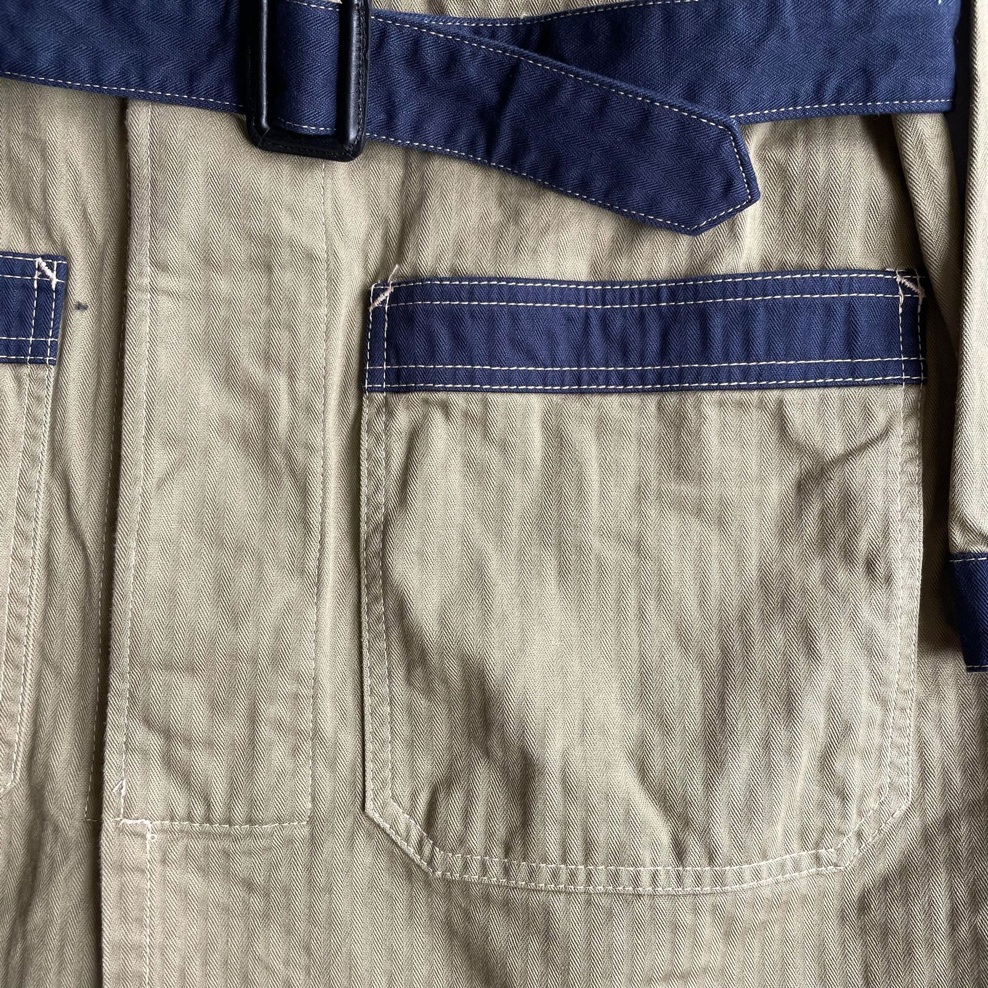 襟、胸ポケット上部、腰ポケット上部、袖カフス部、ウエストベルトが配色になっています。