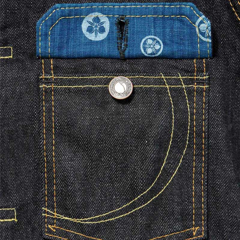 ・裏地に家紋柄の藍染生地を配した両胸のフラップ付きポケット