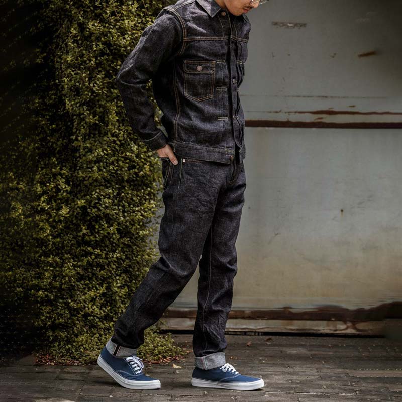 旧式力織機でゆっくりと織り上げた14.7オンスデニム生地は、力強さのある表情を持ち、