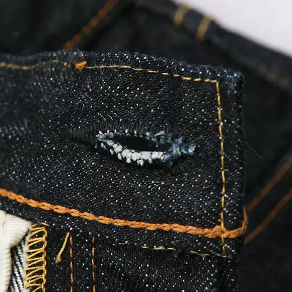 鉄製のリベットに銅メッキを施したリベット。バックポケットの強度を高める為の工夫としてリベット位置を一般的なジーンズより下に下げ、更にリベットの脇ギリギリを縫う事で糸が沈み込み、糸切れも防ぐ作りになっています。