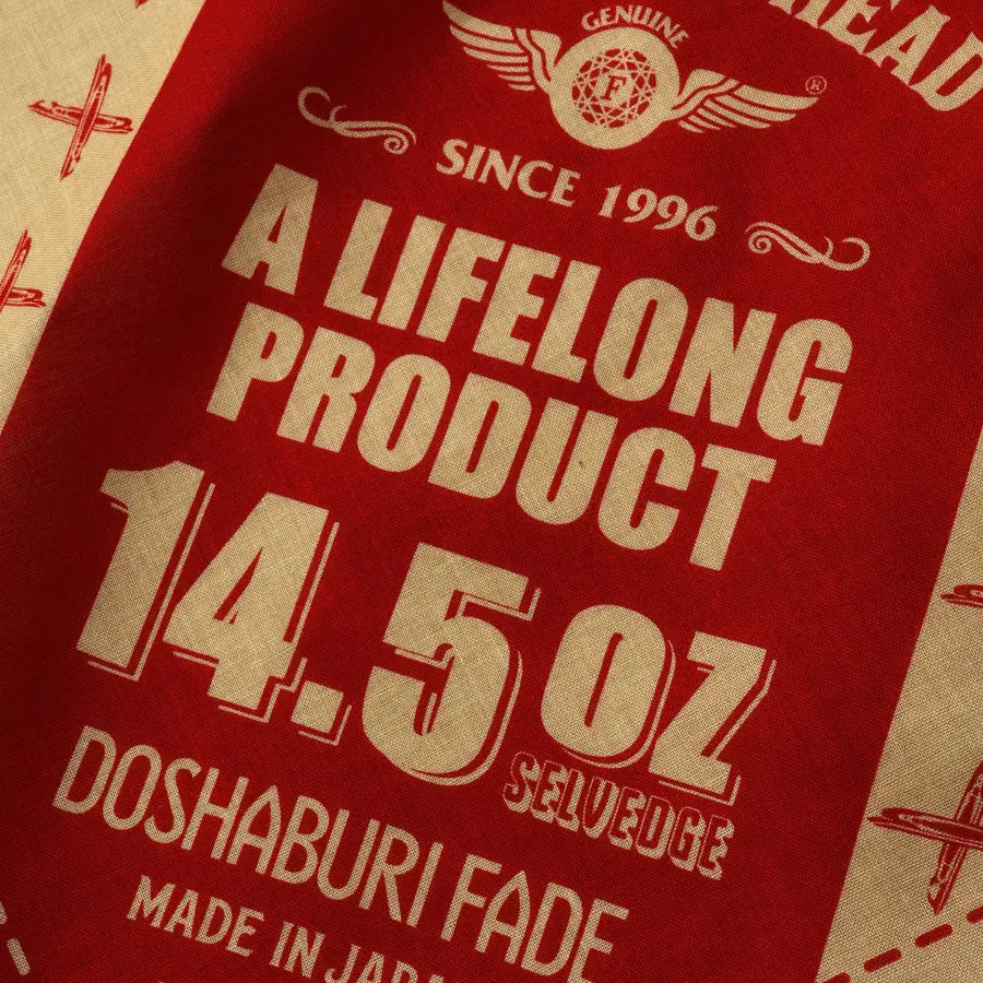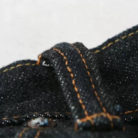 旧式シャトル織機で織り上げることで独特なムラ感のある生地に仕上げています。生地を織るのに使用している特濃色に染め上げた糸は、穿き込むことで濃淡のメリハリが強い色落ちやタテ落ちと呼ばれる色落ちが現れます。