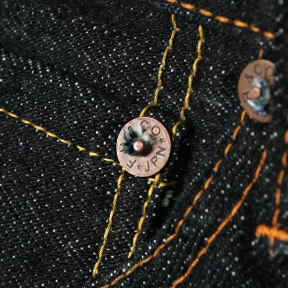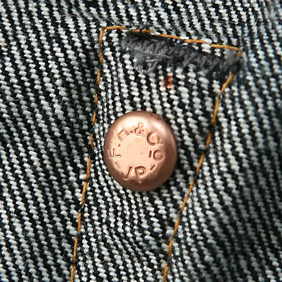 経年変化やジーンズの雰囲気をより楽しめる工夫としてオリジナルの鉄製ボタンを作成。防錆を施すことで、一般的な茶色い錆は出なく、光沢感と黒みを増していきます。
