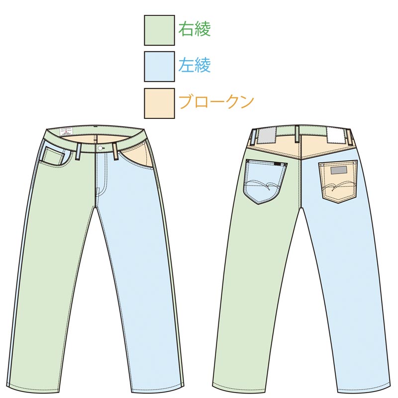 生地の厚さ:右綾デニム15oz・左綾デニム14.6oz・ブロークンデニム12oz