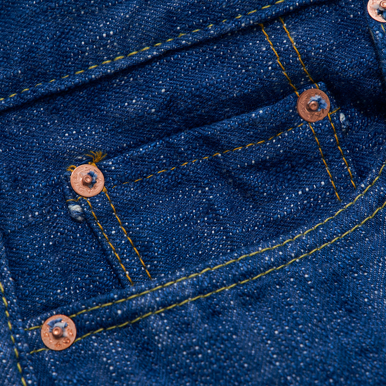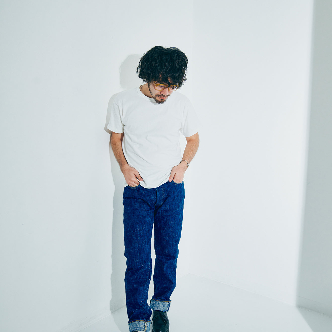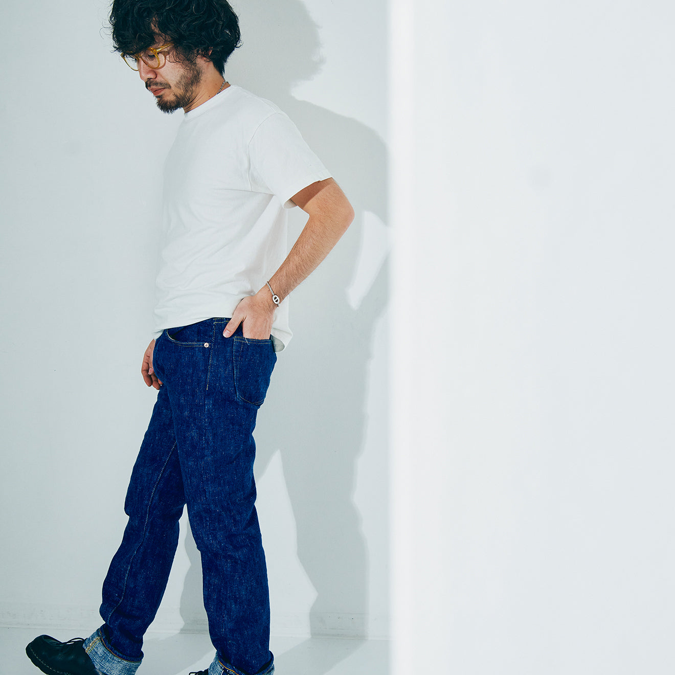 明るく、青みが強いそのインディゴの染料と併せて採用したのは、激しいスラブ糸。経緯共にこの糸を用いることで、斑に緯糸が表に見え、叢雲を表現しています。通常で展開しているデニムと同じよう に、インディゴロープ染色の糸であるため、色落ちも楽しめる1本です。