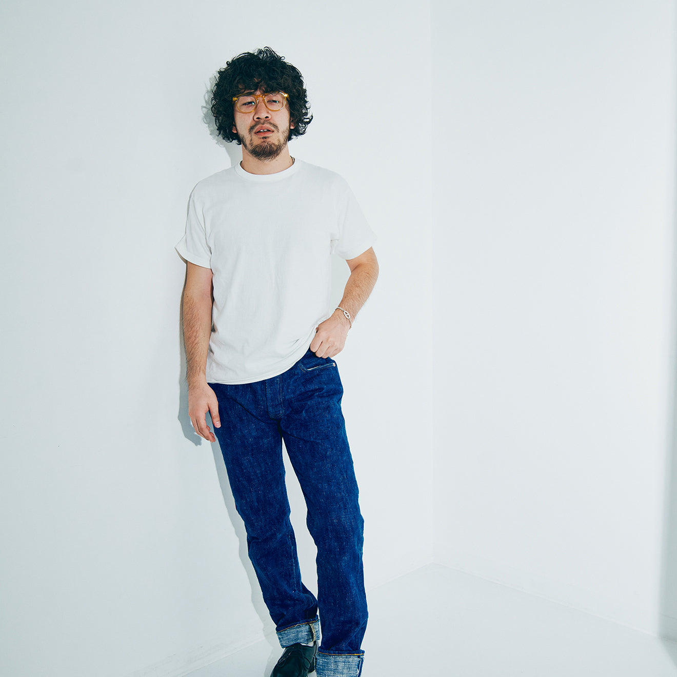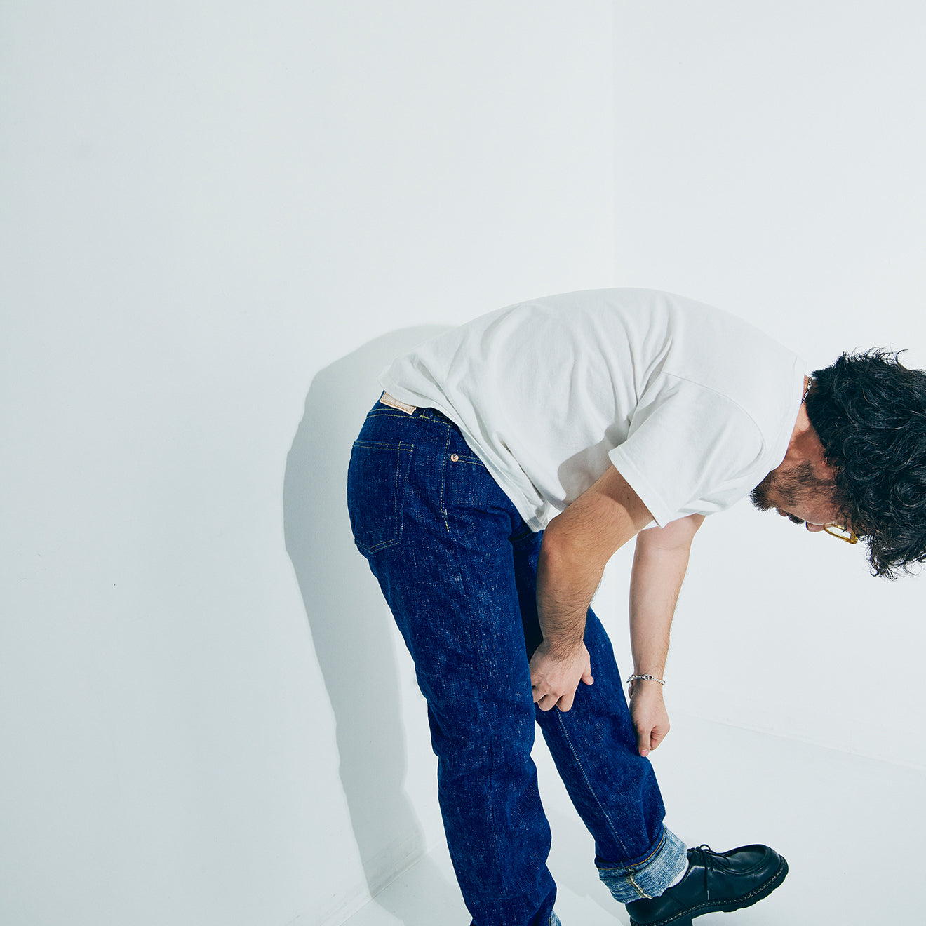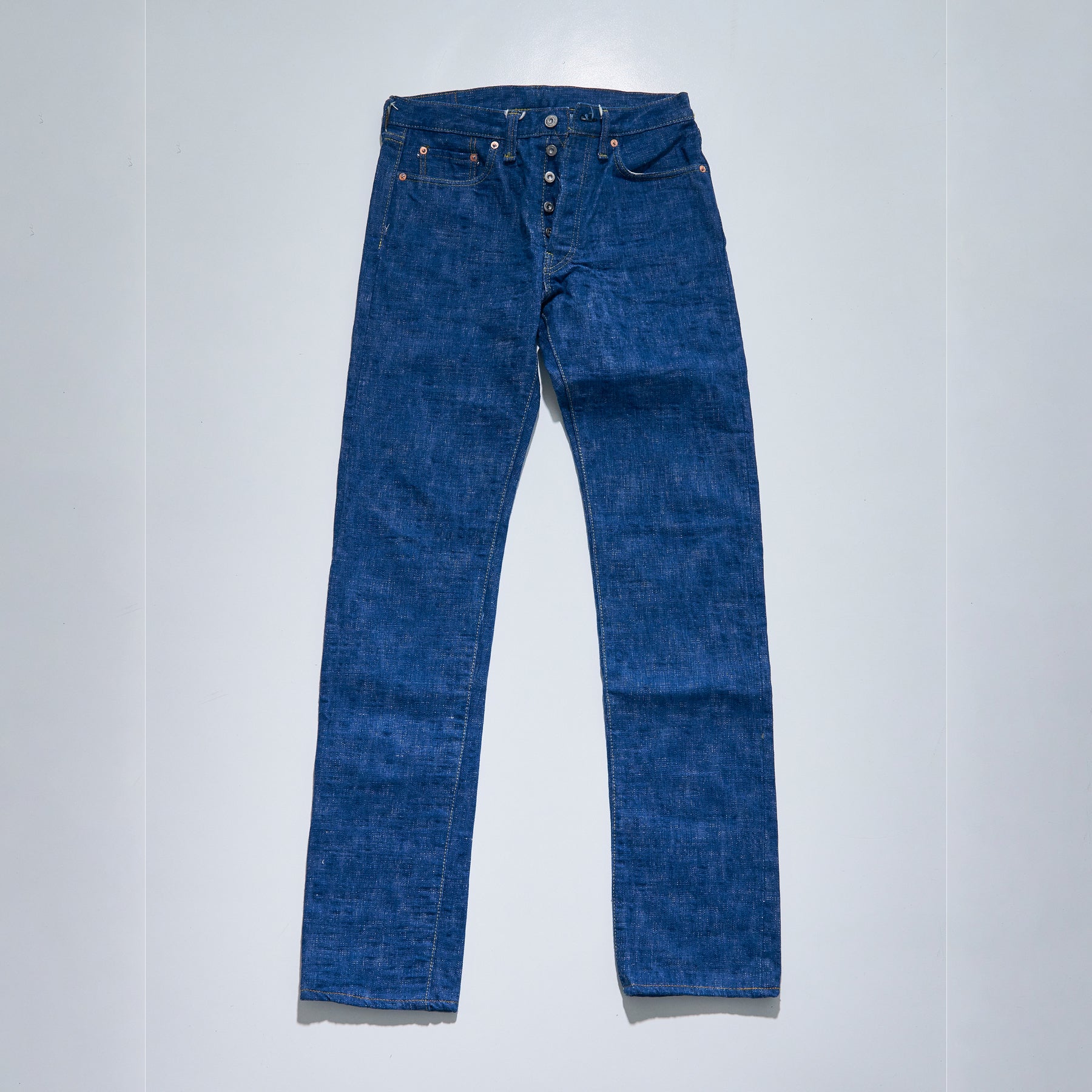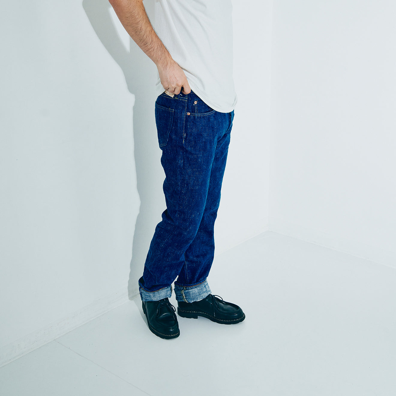 明るく、青みが強いそのインディゴの染料と併せて採用したのは、激しいスラブ糸。経緯共にこの糸を用いることで、斑に緯糸が表に見え、叢雲を表現しています。通常で展開しているデニムと同じよう に、インディゴロープ染色の糸であるため、色落ちも楽しめる1本です。