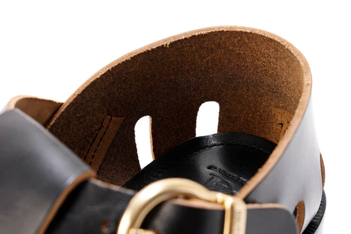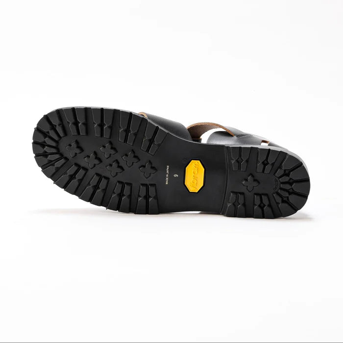 肉厚でコシのある革を一枚革で横幅がゆったりとした木型を用い、ソックスで合わせる事も想定した作りになっております。また、耐久性のあるVibramソールを装着した長年履くことのできるサンダルです。