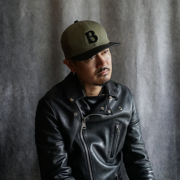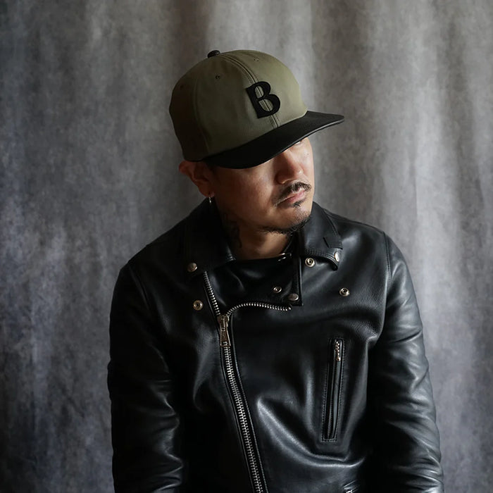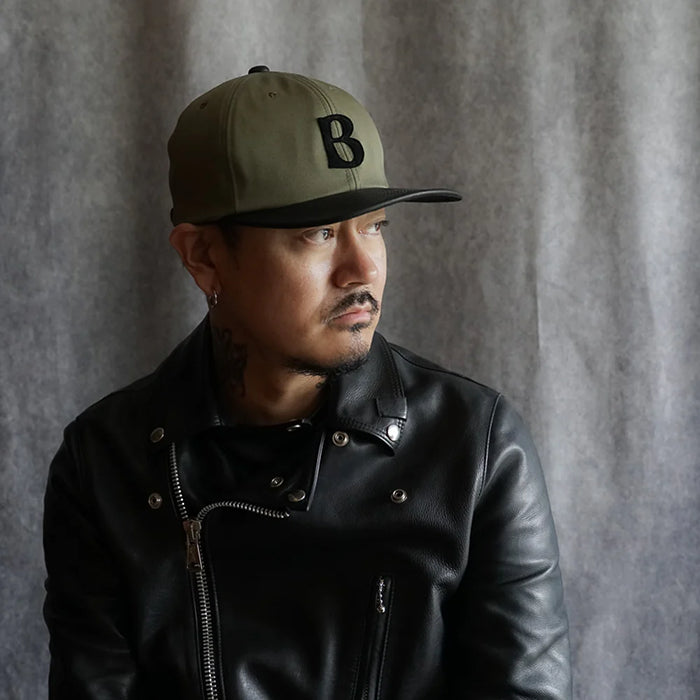 夏季限定販売。クラウンがCOTTON100%、ブリムや天ボタン、ベルトにはフルベジタブルタンニンなめしの牛革を、ブリム裏にはヌバック、Bロゴにはスエードを使用したベースボールキャップ。