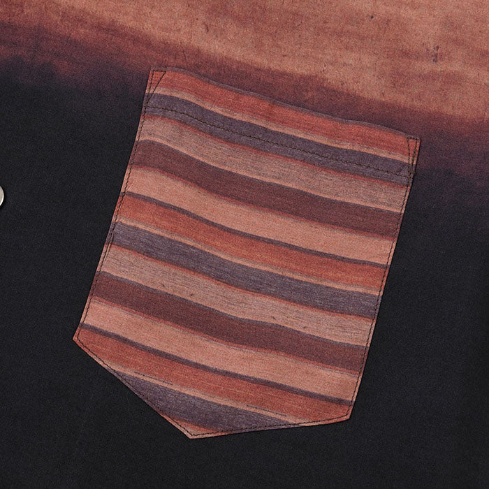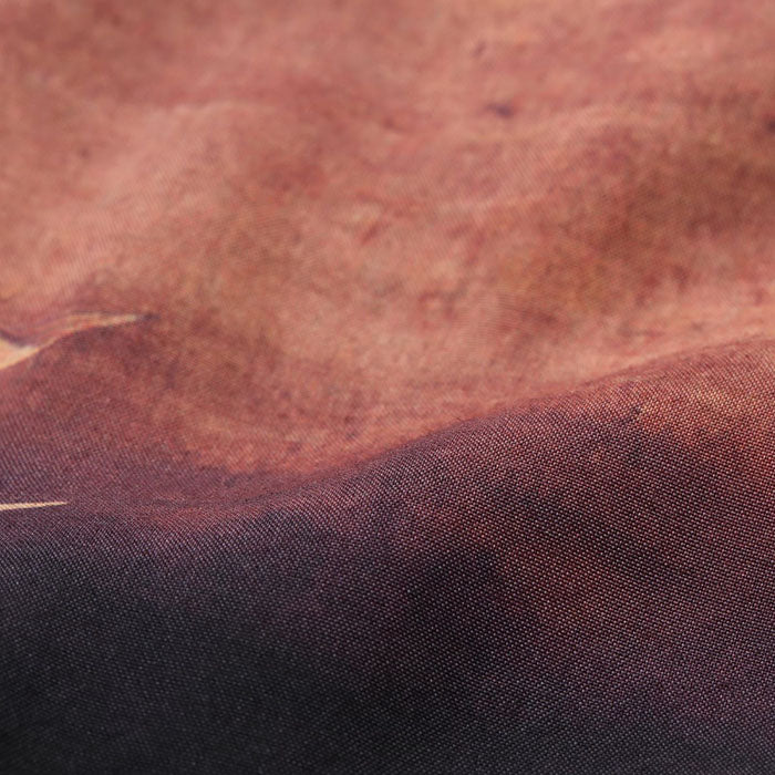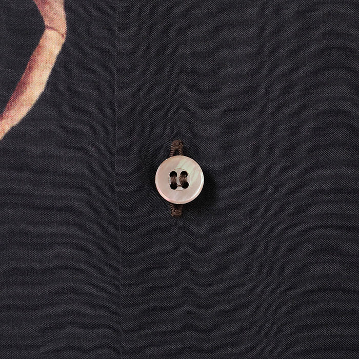 伊藤若冲は1716年、京都の青物問屋に生まれるが、絵を描くこと以外に興味が無く、家業を放棄して山に籠ることもあった。その類稀なる才能は奇抜な発想として作品に現れ、現代でも人々を魅了している。今回、伊藤若冲の作品をアロハシャツとして表現するにあたり、原画名を冠した「付喪神図」では、前後の違いを楽しめるよう強弱をつけてモチーフを配置。落款や外枠の縞模様なども加え、1950年代のテイストに仕上げた。