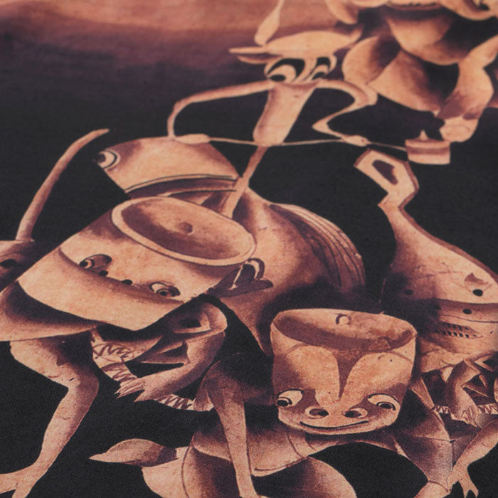 日本に古くからある言い伝えに「百年を経た器物には神や精霊が宿り人々にイタズラをする」というものがある。そのような民間信仰から、器物に宿った精霊を付喪神(つくもがみ)と呼ぶようになり、妖怪画として表現されていった。それらは人に恐怖を与えるために描かれた幽霊画と異なり、親しみやすい画風が多いのも特徴。本作の題材となった伊藤若冲の『付喪神図』に登場する妖怪たちにも、そのような特徴が見受けられる。グラデーションで表現された薄明かり。そして、ぼんやりと光があたる闇の空間で列をなす付喪神たち。前の方は茶釜や水指、茶碗など長年使い込まれた茶道具の妖怪で、それらに続き燭台や鳥兜(舞楽で用いられる鳳凰の頭かたどった装飾品)、琵琶や皷など、様々な器物の付喪神が登場している。