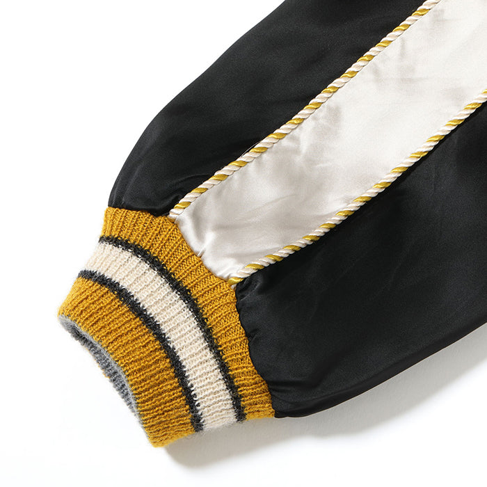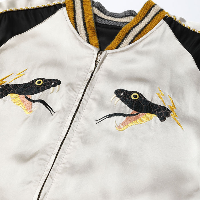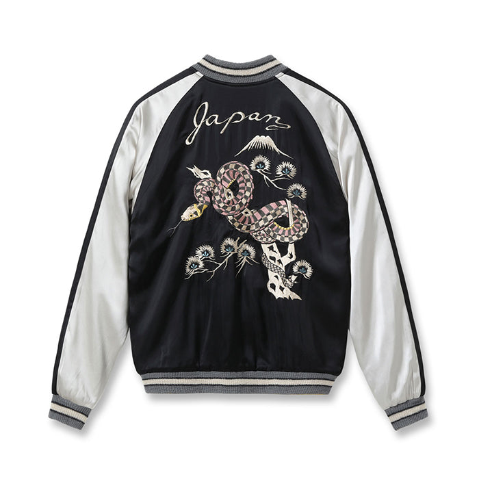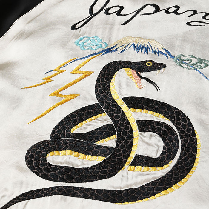 表面は稲妻が走る富士山をバックに、とぐろを巻き威嚇する黒蛇の絵柄。ヴィンテージのスカジャンにおいて龍は雷雲とともに描かれることが多く、日本では古来より龍と蛇が密接な関係にあることから本作ではその構図を取り入れ、1950年代当時に作られたかのような雰囲気を纏ったデザインに仕上げている。モチーフとなっているのは日本で最も強い毒を持つとされる「ヤマカガシ」。腹の黄色に合わせ、リブや袖のパイピングにもイエローを差し、黒を基調とした刺繍の迫力を際立たせている。