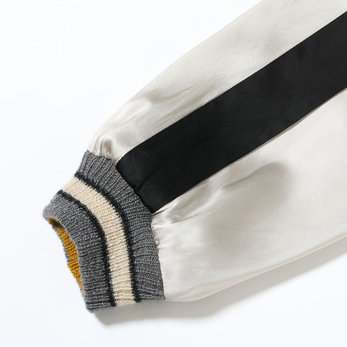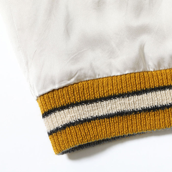 テーラー東洋のコレクションの中でも特に厳選した逸品をディテールにこだわり再現するのが、このスペシャルエディション。横振り刺繍で緻密に描かれた図案はもとより、アセテート生地の打ち込みを調整してヴィンテージと遜色なく仕上げ、ウールリブも旧式の横編み機を使用して1着ずつ編み上げている。リバーシブル仕様のファスナーについても50年以上前のファスニング機械を再稼働させ、当時と同じ手曲げのものを再現。テーラー東洋の前身である港商(こうしょう)商会のラベルを使い、ヴィンテージスカジャンの最盛期を彷彿とさせる仕上がりとなっている。