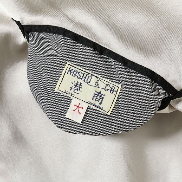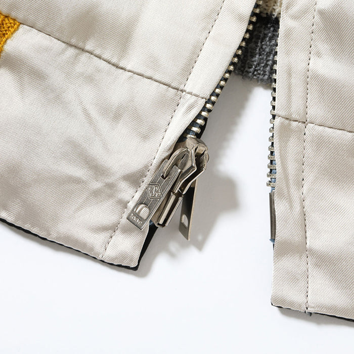 ややデフォルメされた表面の絵柄に対し、リバーシブル面では松の枝に巻きつくヤマカガシを写実的に描写。こちらは毒蛇ならではの警戒色である赤の斑紋を持つ個体をモチーフにしている。褪色したピンクに近い赤と黒の市松模様のような斑紋が横振り刺繍の立体感を駆使して緻密に表現されており、モノトーンのボディに派手な刺繍が映える一着。また本作では60周年を機に、テーラー東洋の前身である「港商」のロゴが刻印されたスライダー(ファスナーの引き手)を製作して使用。アニバーサリーモデルに相応しい仕上がりとなっている。